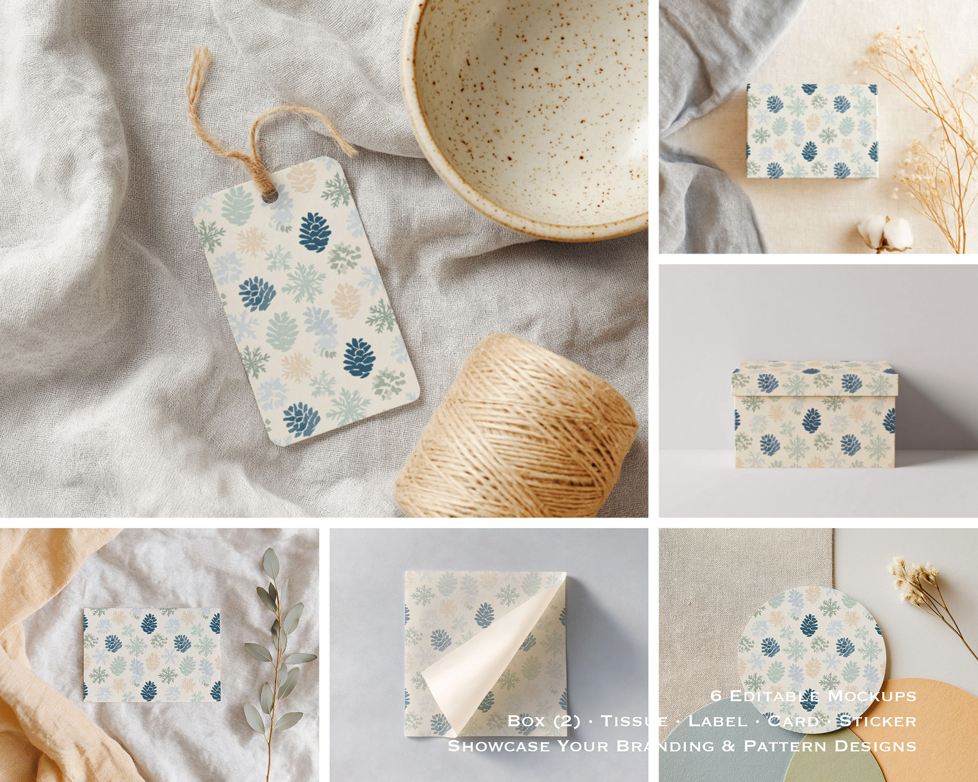 A beautifully styled mockup set designed to showcase your patterns, gift wrap designs, and branding elements on tags, boxes, cards, and stickers.