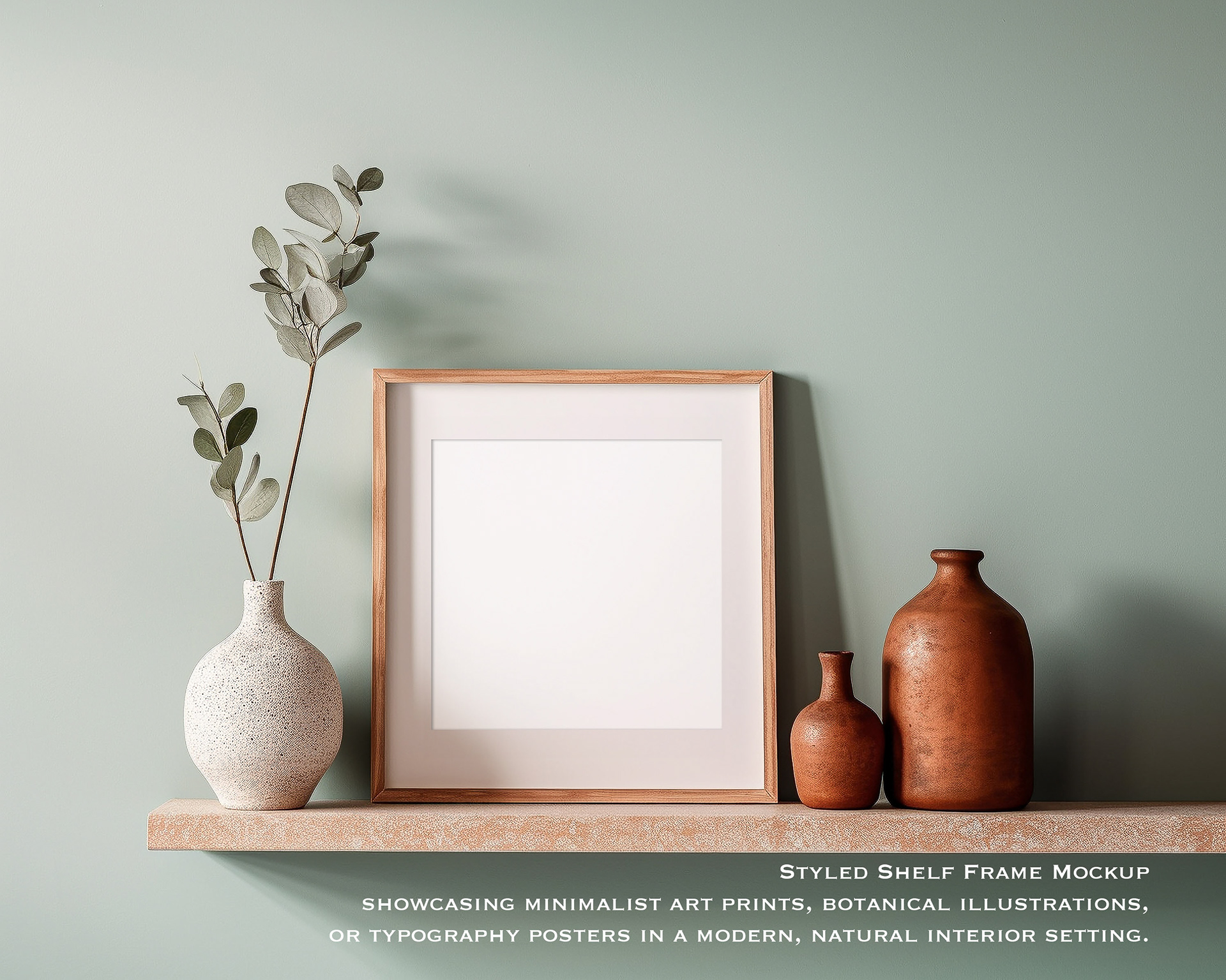 Styled Shelf Frame Mockup, ideal for showcasing minimalist art prints, botanical illustrations, or typography posters in a modern, natural interior setting.