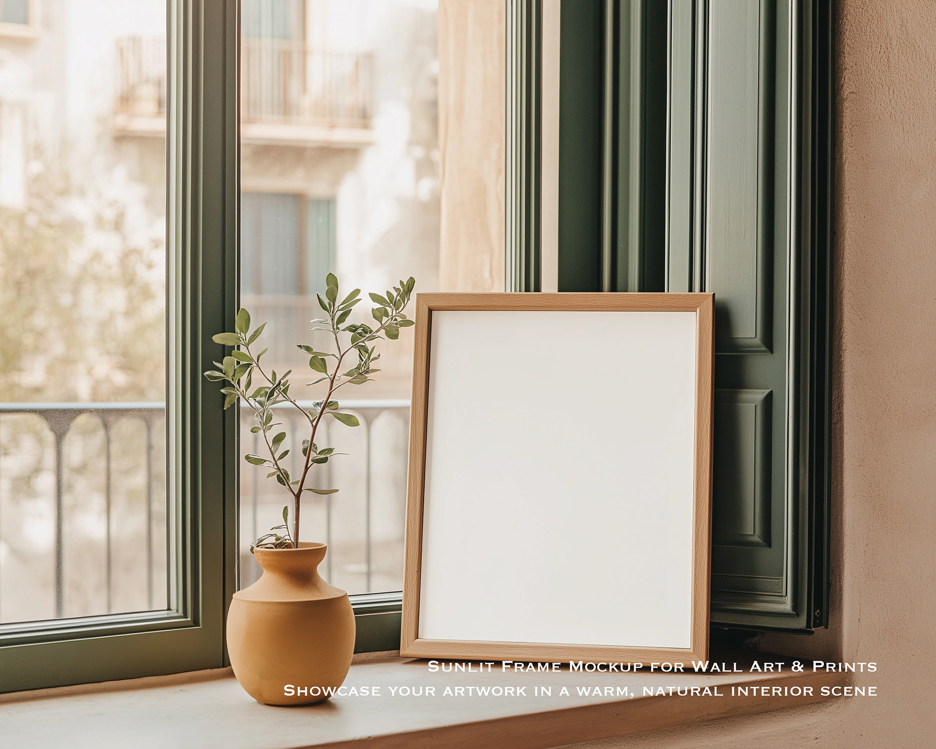 Sunlit Window Sill Frame Mockup, ideal for presenting botanical prints, minimalist watercolour paintings, or seasonal illustrations with a warm, natural vibe.