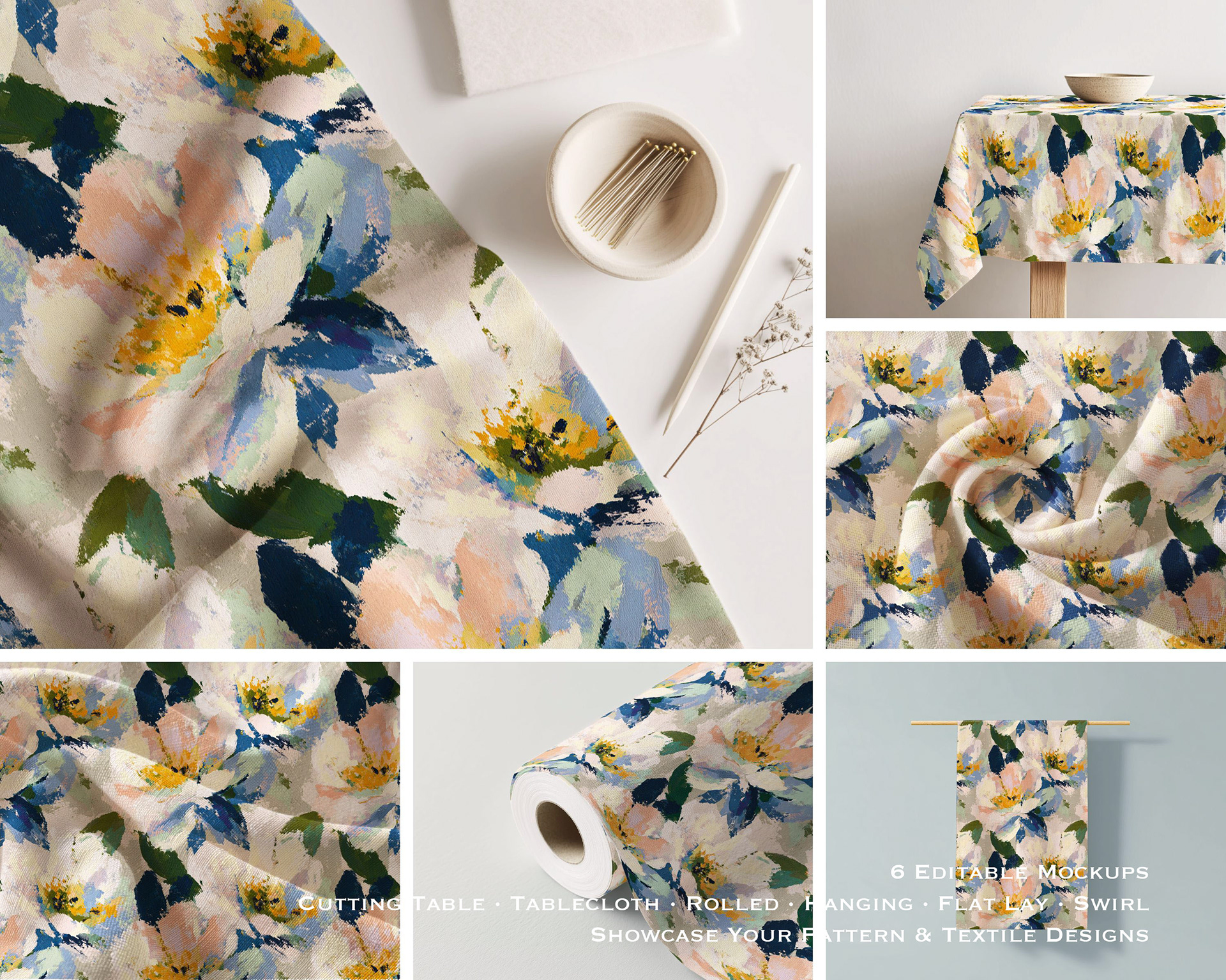 A versatile fabric mockup collection, ideal for showcasing seamless patterns, textile designs, or surface illustrations in a clean, minimal Scandinavian setting.